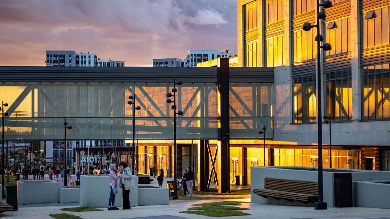 На прилегающей территории создана парковая зона, насыщенная арт-объектами. Уличное пространство площадью 7,2 га адаптировано для различных форматов времяпрепровождения: здесь предусмотрены места для работы на свежем воздухе, деловых встреч, занятий спортом и прогулок. Такое окружение позволяет нивелировать границу между рабочими процессами и отдыхом, создавая среду, характерную для современных городских кластеров.