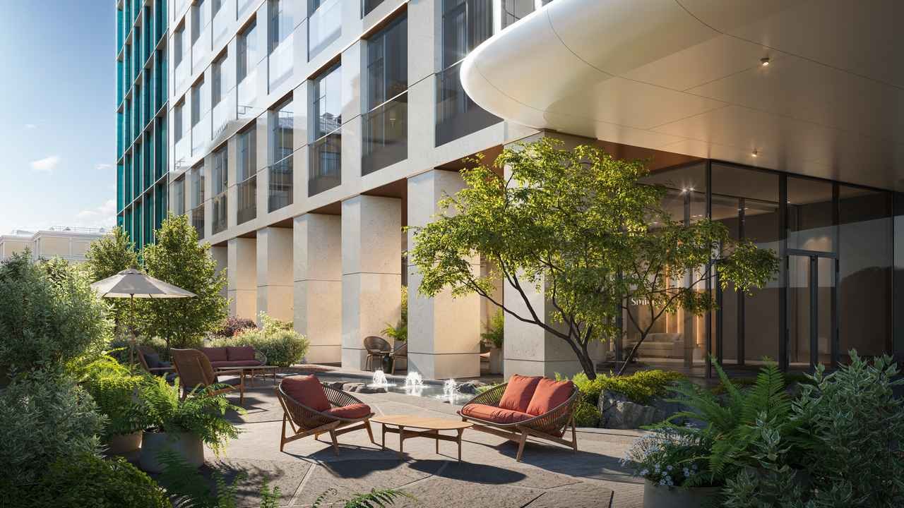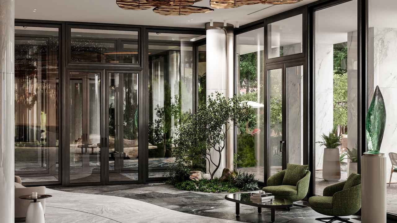 Из двора предусмотрен переход в приватное лобби, летние витражи которого могут полностью открываться, объединяя внутреннее и уличное пространство. В отделке холла использованы латунь, стекло и мрамор в карамельных, шоколадных и янтарных тонах. Здесь же оборудованы колясочная и гостевой санитарный узел.