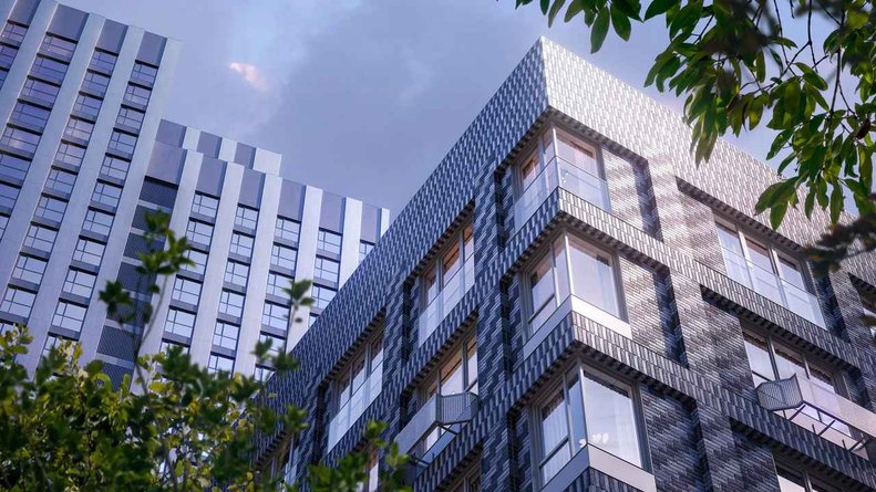 Выдающимся элементом архитектурного ансамбля является 30-этажная жилая башня с отделкой металлическими панелями и фасадным сплошным остеклением. Для фасадов прочих зданий подобраны разнообразные геометрические орнаменты и материалы натуральных оттенков.