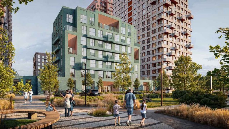 Чтобы прогулки во дворе были приятными и безопасными, на территории проекта предусмотрена «медленная зона» для электросамокатов. В период с 07:00 до 24:00 их скорость автоматически снижается до 15 км/ч.