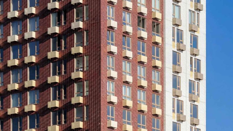 В дизайне фасадов авторы проекта использовали прием «раскреповки», добавив по всей вертикали хаотичный орнамент выступов. При этом для каждого здания подобрано индивидуальное цветовое решение.