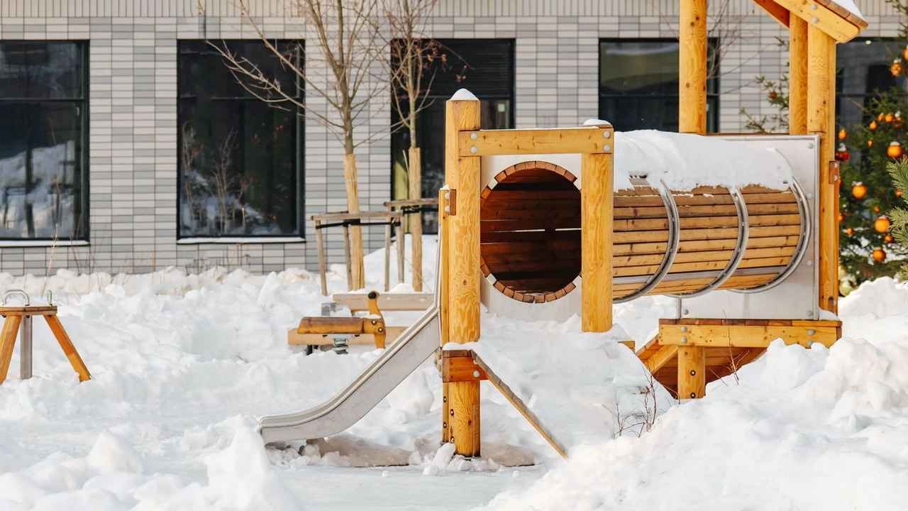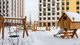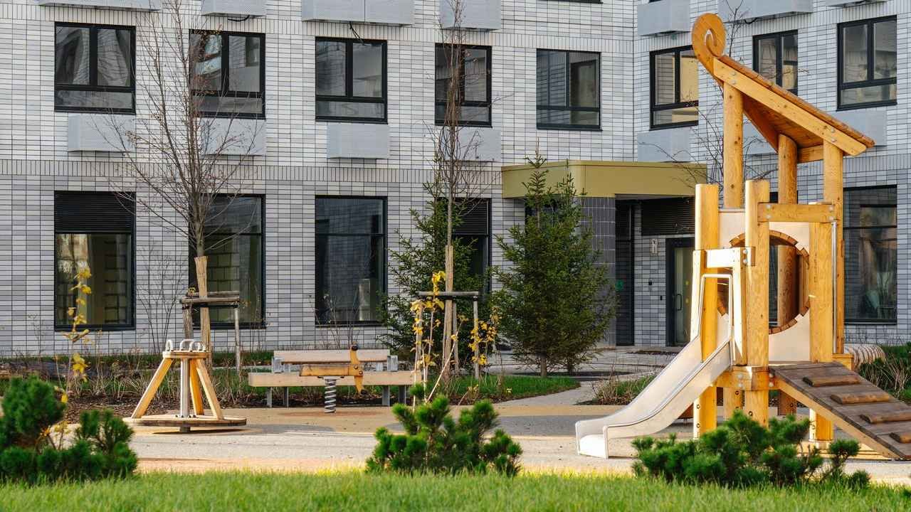 Во дворе оборудованы детские игровые городки, состоящие из элементов абстрактных форм, чтобы дети могли каждый раз выдумывать новые сценарии игр. Безопасное прорезиненное покрытие защитит ребенка от ушибов и ссадин в случае падения.
