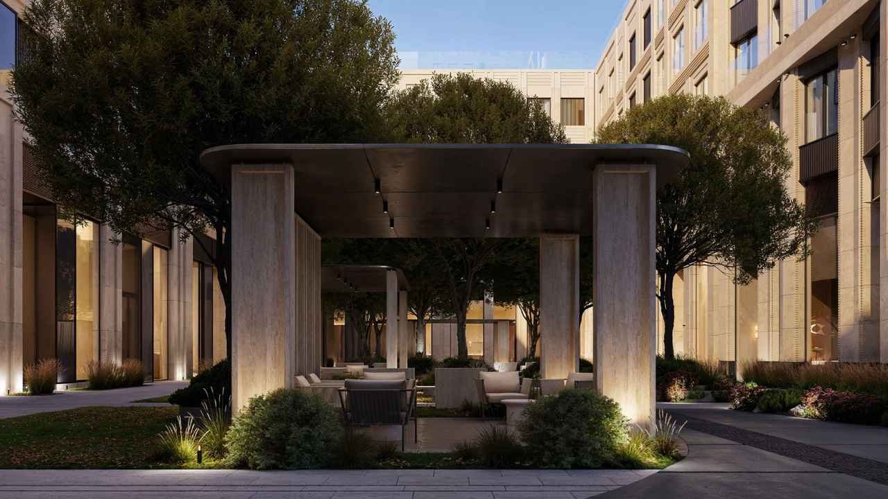 На территории комплекса создана приватная, озелененная зона отдыха. Через двор проложены аллеи, высажены взрослые деревья и кустарники, организованы тихие уголки. Активные зоны, включая детские и спортивные площадки, вынесены к внешнему контуру, что разделяет динамичные и спокойные функциональные области.
