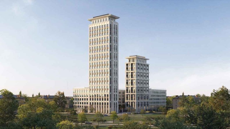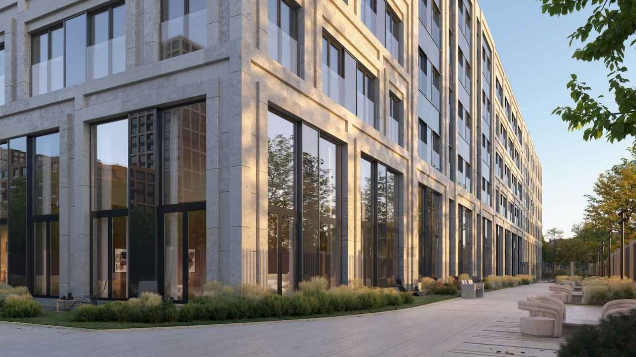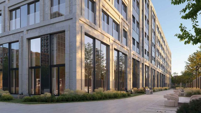 Общая композиция, разработанная бюро СПИЧ, имеет С-образную конфигурацию с приватным двором в центре. Фасады оформлены долговечным стеклофибробетоном, стойким к погодным воздействиям. Декоративные элементы — русты, пилоны и карнизы — отсылают к неоклассическому стилю, при этом каждая секция обладает индивидуальным обликом. Архитектурный рельеф дополняют ниши открытых балконов.