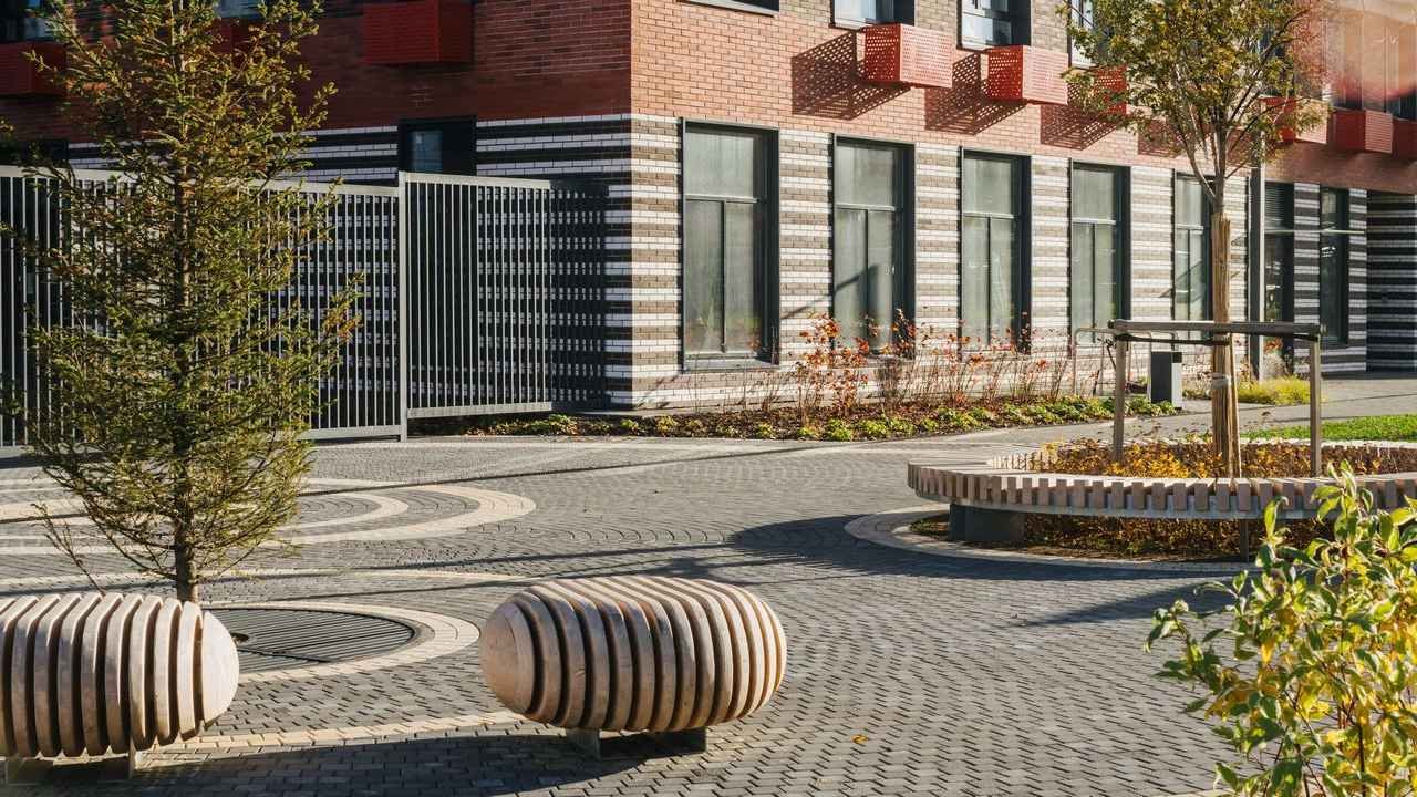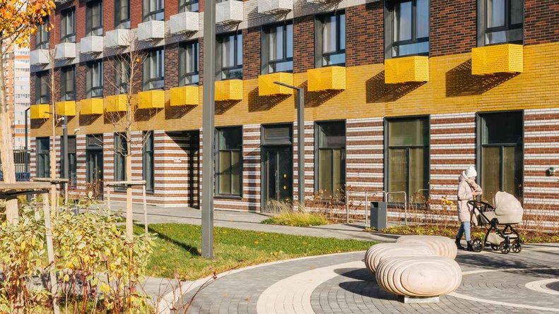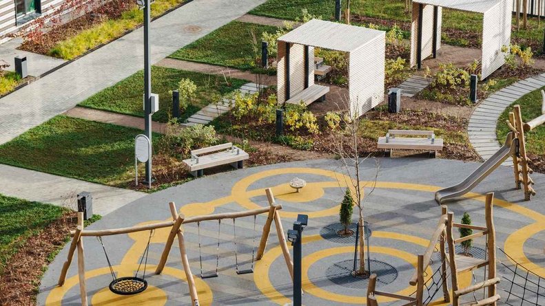 Чтобы прогулки во дворе были приятными и безопасными, на территории проекта предусмотрена «медленная зона» для электросамокатов. В период с 07:00 до 24:00 их скорость автоматически снижается до 15 км/ч.