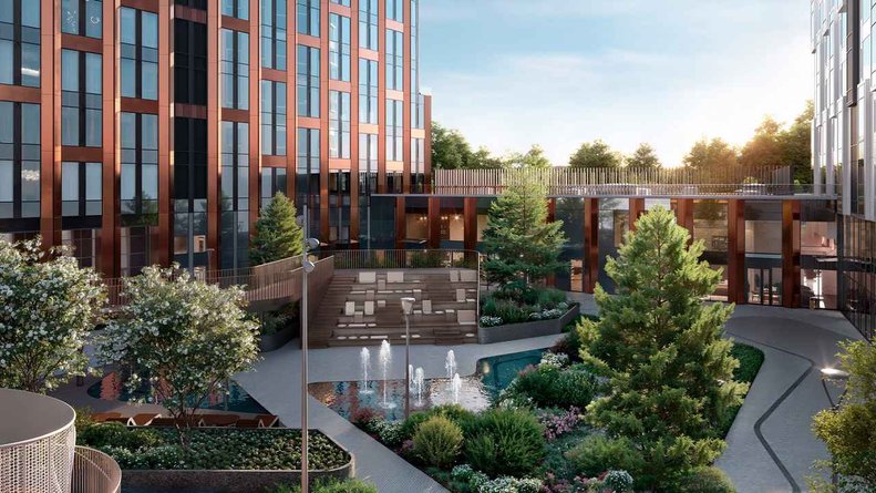 Благодаря красоте природы, вдохновленной русскими просторами, жители комплекса могут расслабиться на качелях, провести деловую встречу в тени перголы, прогуляться по зеленому двору или насладиться арт-променадом – цифровой рекой, символизирующей жизненный поток.