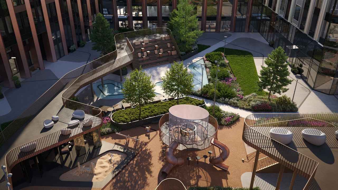 Внутренний двор комплекса создан специально для резидентов и является идеальным местом для отдыха и общения. Дети найдут здесь множество мест для игр и развлечений на игровых площадках, оформленных разнообразными цветами, фигурами и материалами.