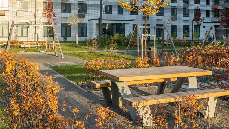 Чтобы прогулки во дворе были приятными и безопасными, на территории проекта предусмотрена «медленная зона» для электросамокатов. В период с 07:00 до 24:00 их скорость автоматически снижается до 15 км/ч.