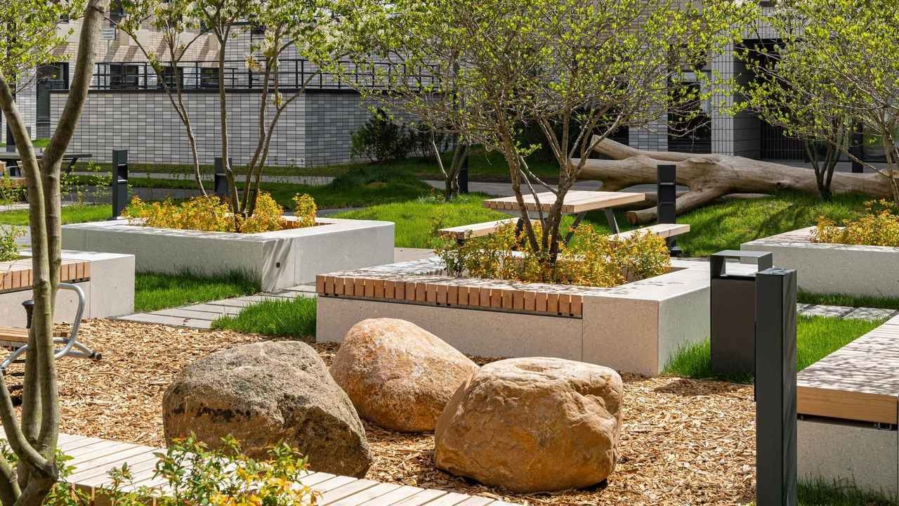 Жилые корпуса образуют серию закрытых дворов с пешеходным бульваром, игровыми и спортивными площадками SportHub. Его открыли в 2024 году. В SportHub входят поля для футбола, баскетбола, волейбола и стритбола. Зимой центральную часть заливают под каток.