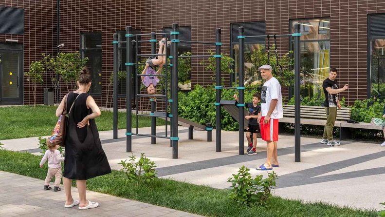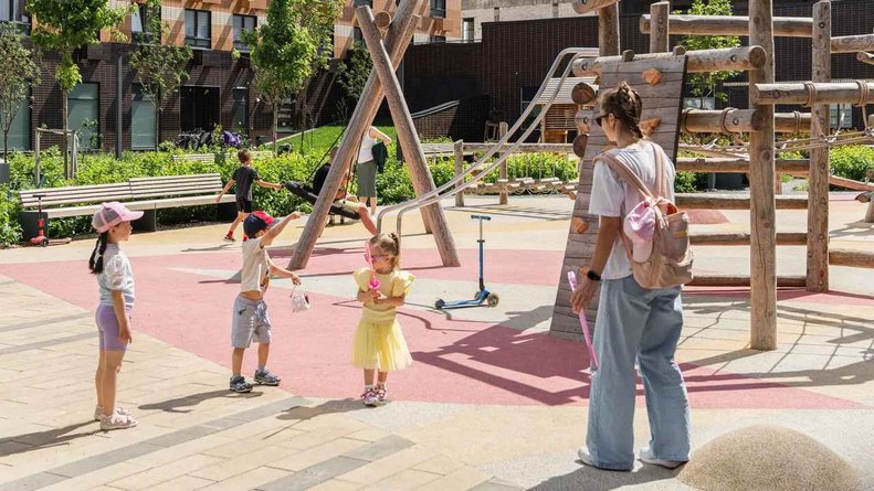 Чтобы прогулки во дворе были приятными и безопасными, на территории проекта предусмотрена «медленная зона» для электросамокатов. В период с 07:00 до 24:00 их скорость автоматически снижается до 15 км/ч.