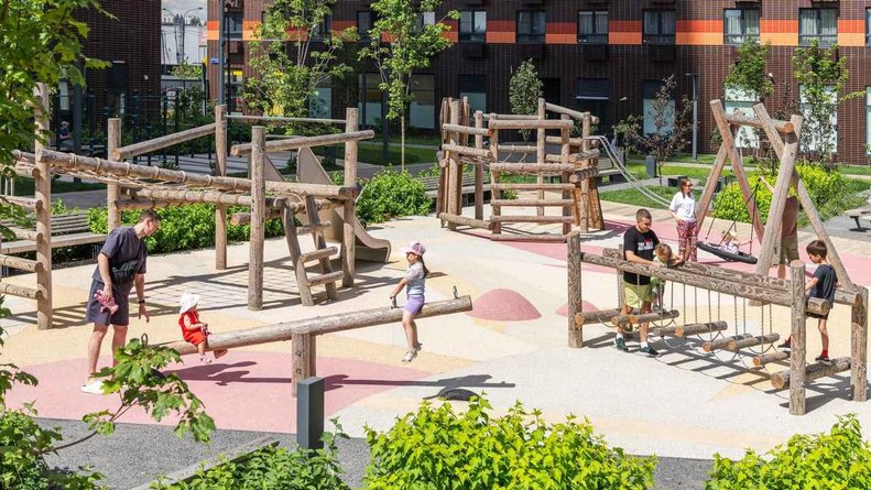 Площадка для детей предлагает разнообразные формы игр и активностей. Аттракцион, который никогда не наскучит — это полоса препятствий с тоннелями и куполами для лазанья, канатными сетками и тросом скоростного спуска.