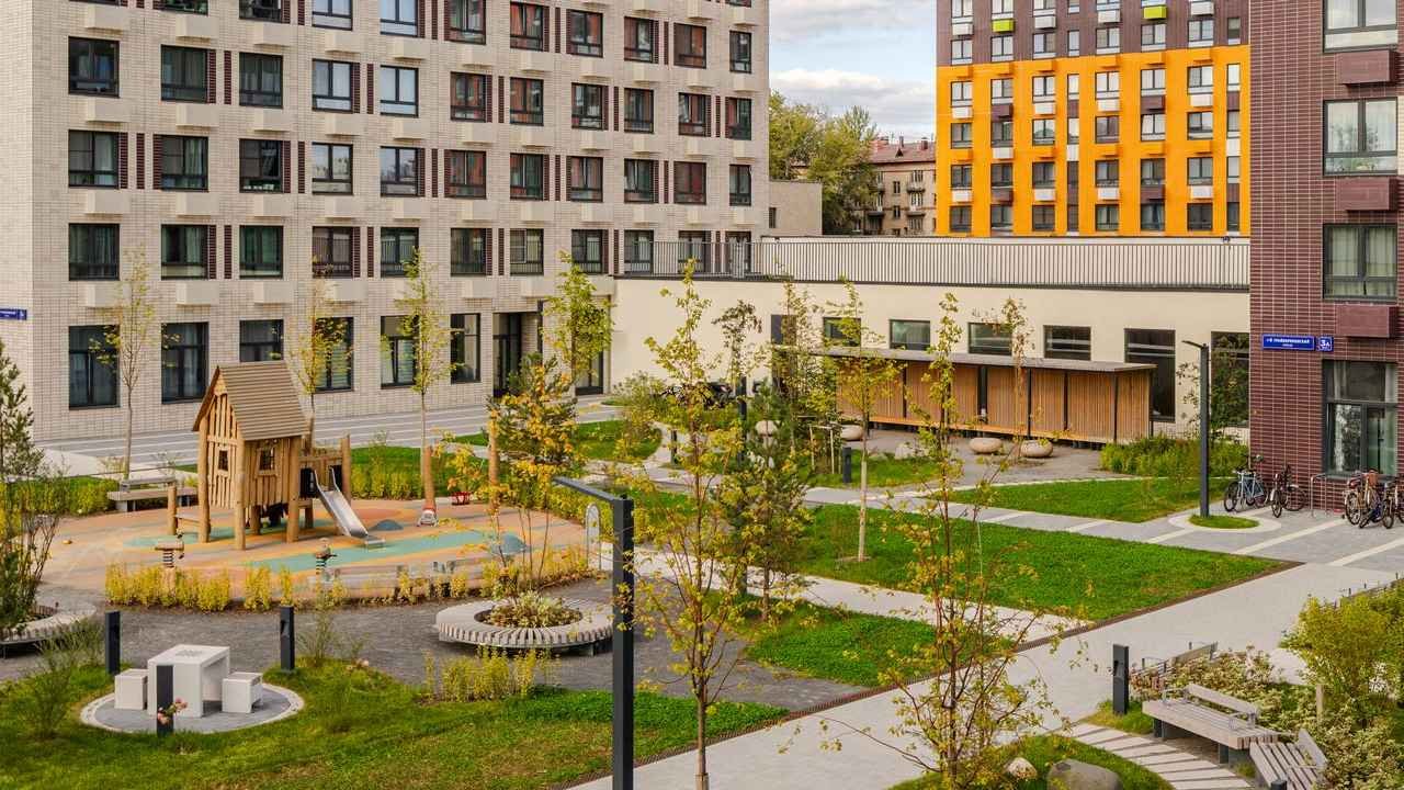 Чтобы прогулки во дворе были приятными и безопасными, на территории проекта предусмотрена «медленная зона» для электросамокатов. В период с 07:00 до 24:00 их скорость автоматически снижается до 15 км/ч.