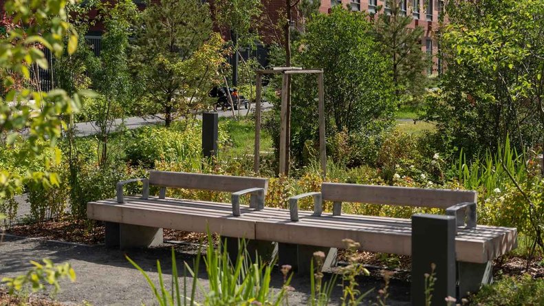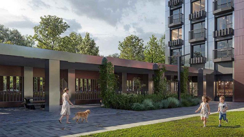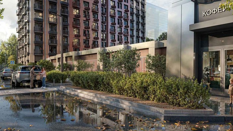 Чтобы прогулки во дворе были приятными и безопасными, на территории проекта предусмотрена «медленная зона» для электросамокатов. В период с 07:00 до 24:00 их скорость автоматически снижается до 15 км/ч.