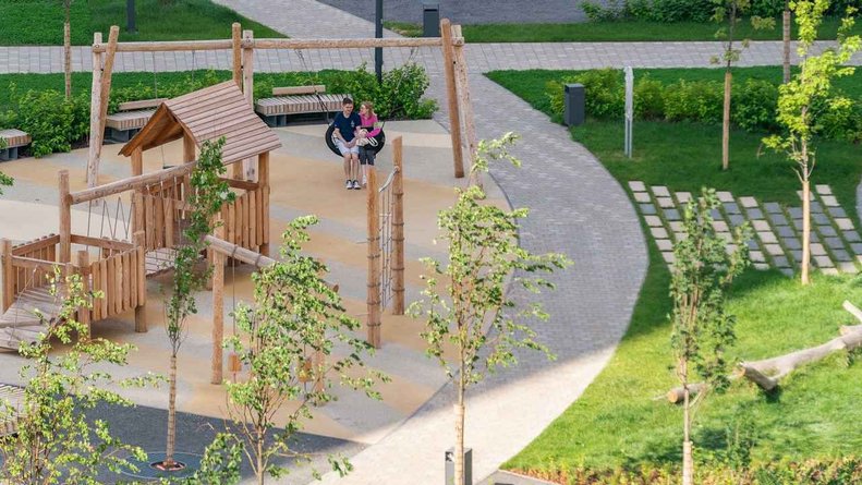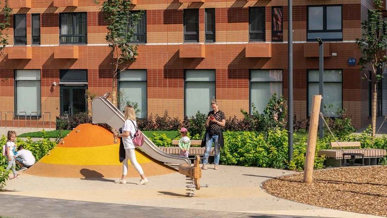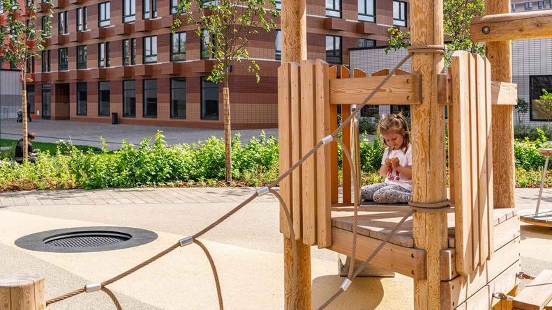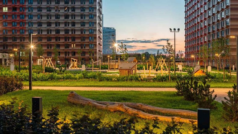 Чтобы прогулки во дворе были приятными и безопасными, на территории проекта предусмотрена «медленная зона» для электросамокатов. В период с 07:00 до 24:00 их скорость автоматически снижается до 15 км/ч.