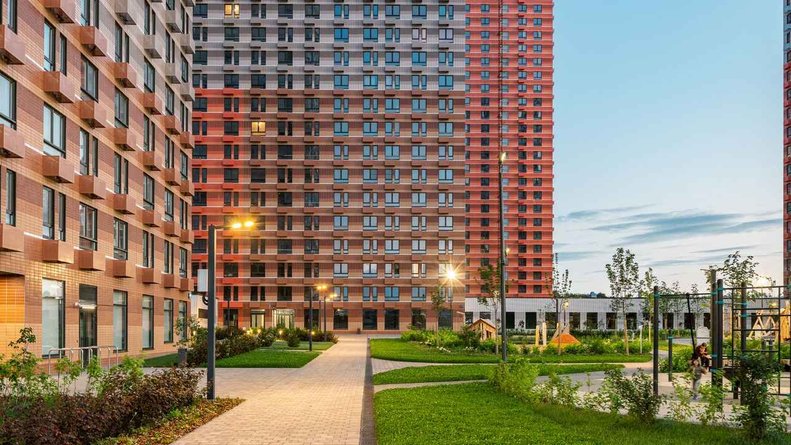 На первых этажах разместятся магазины, кафе, салоны красоты и другие сервисы. Из холлов два выхода — на улицу или во двор-парк. На его территории высадят побольше деревьев и кустарников, так чтобы сформировались тихие скверы, смонтируют детские площадки, обустроят футбольное и баскетбольное поля.